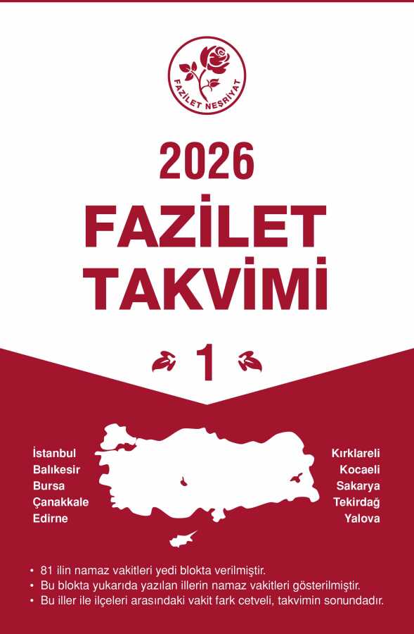Gelince Haber Ver| Fazilet Takvimi, büyük bir titizlikle Ehl-i Sünnet akâidi üzere hazırlanıp okuyucularımızın istifadesine sunulmuştur. Her sene mûteber eserler taranarak ve en mühim bilgiler seçilerek yeniden hazırlanıp okuyuculara arz edilmektedir. Fazilet Neşriyat, Fazilet Takvimi'ni duvar ve ciltli takvimden sonra büyük boy ciltli takvim olarak da yayınlamaya başlamıştır. Bütün dünyaya hitap eden müessesemiz Türkiye haricinde yaklaşık 204 ülkede 3700 şehre hitap eden namaz vakitleri portföyü ile dünya Müslümanları için mühim bir hizmet îfâ etmektedir. 1. Bölge İlleri: İstanbul, Balıkesir, Bursa, Çanakkale, Edirne, Kırklareli, Kocaeli, Sakarya, Tekirdağ, Yalova |