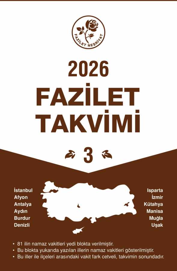 Gelince Haber Ver| Fazilet Takvimi, büyük bir titizlikle Ehl-i Sünnet akâidi üzere hazırlanıp okuyucularımızın istifadesine sunulmuştur. Her sene mûteber eserler taranarak ve en mühim bilgiler seçilerek yeniden hazırlanıp okuyuculara arz edilmektedir. Fazilet Neşriyat, Fazilet Takvimi'ni duvar ve ciltli takvimden sonra büyük boy ciltli takvim olarak da yayınlamaya başlamıştır. Bütün dünyaya hitap eden müessesemiz Türkiye haricinde yaklaşık 204 ülkede 3700 şehre hitap eden namaz vakitleri portföyü ile dünya Müslümanları için mühim bir hizmet îfâ etmektedir. 3. Bölge İlleri: İstanbul, Afyon, Antalya, Aydın, Burdur, Denizli, Isparta, İzmir, Kütahya, Manisa, Muğla, Uşak |